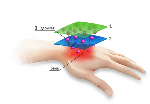1. Воздухопроницаемая текстильная основа 2. Альгинат натрия — природный полимер 3. Дезоксирибонуклеат натрия — деринатСпособ применения
